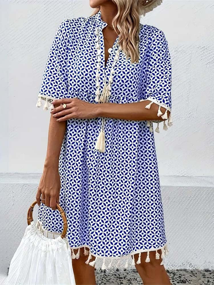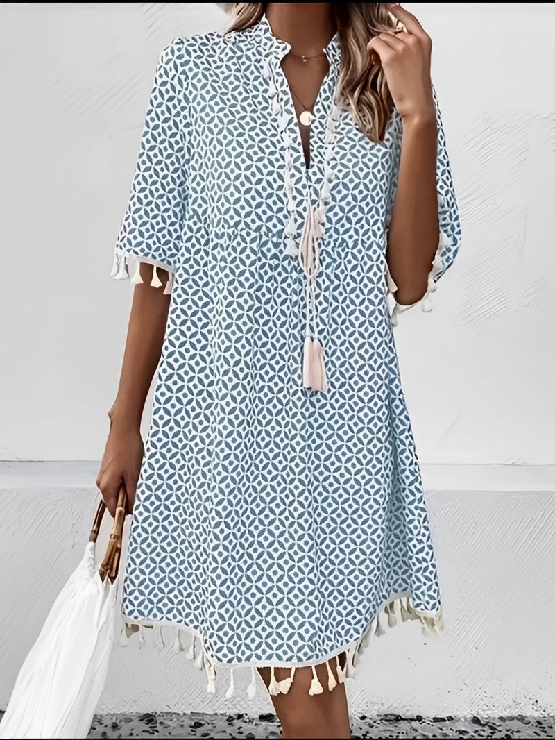 هذا الفستان الصيفي يتميز بنقشة عصرية وقصة مريحة. أكمامه القصيرة وخفته تجعله اختيارًا مثاليًا للأيام المشمسة. مثالي للمدينة أو العطلات أو الخروج مع الأصدقاء.
