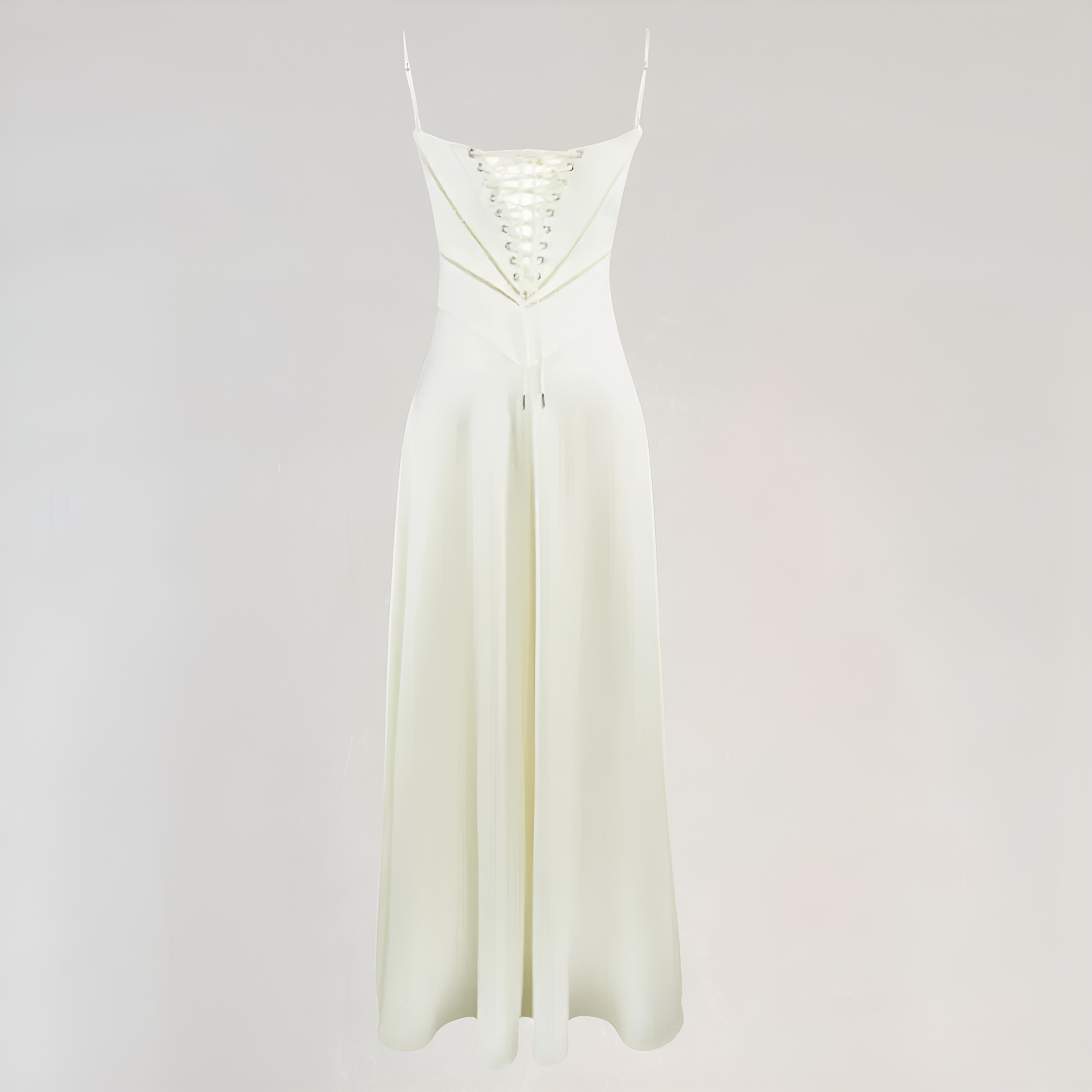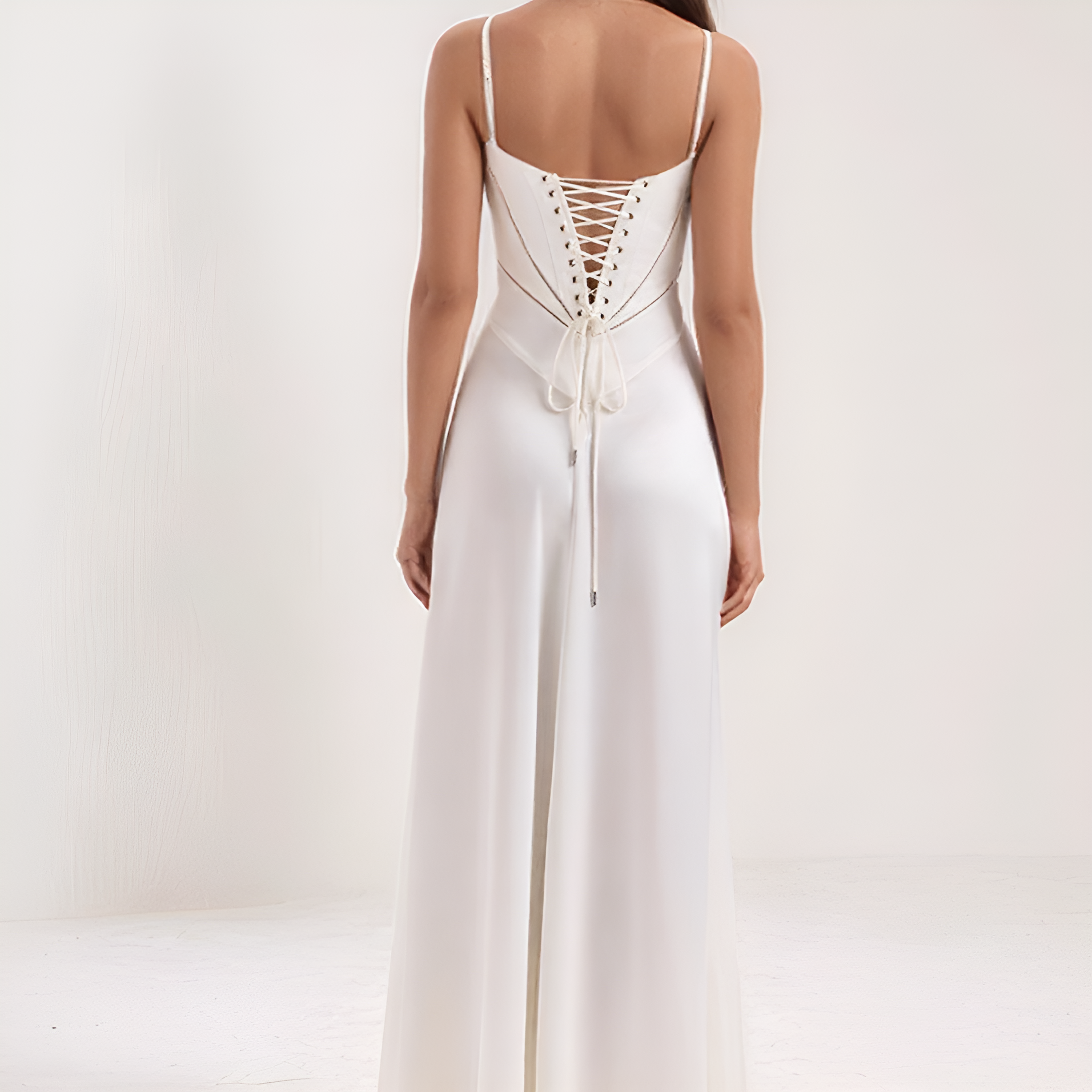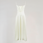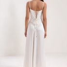 This long dress enhances the silhouette with its corset-style bodice that delicately highlights the waist. Its fluid cut adds movement and grace, while the corseted back adds a romantic and structured touch. Ideal for evenings, galas, or ceremonies.