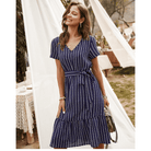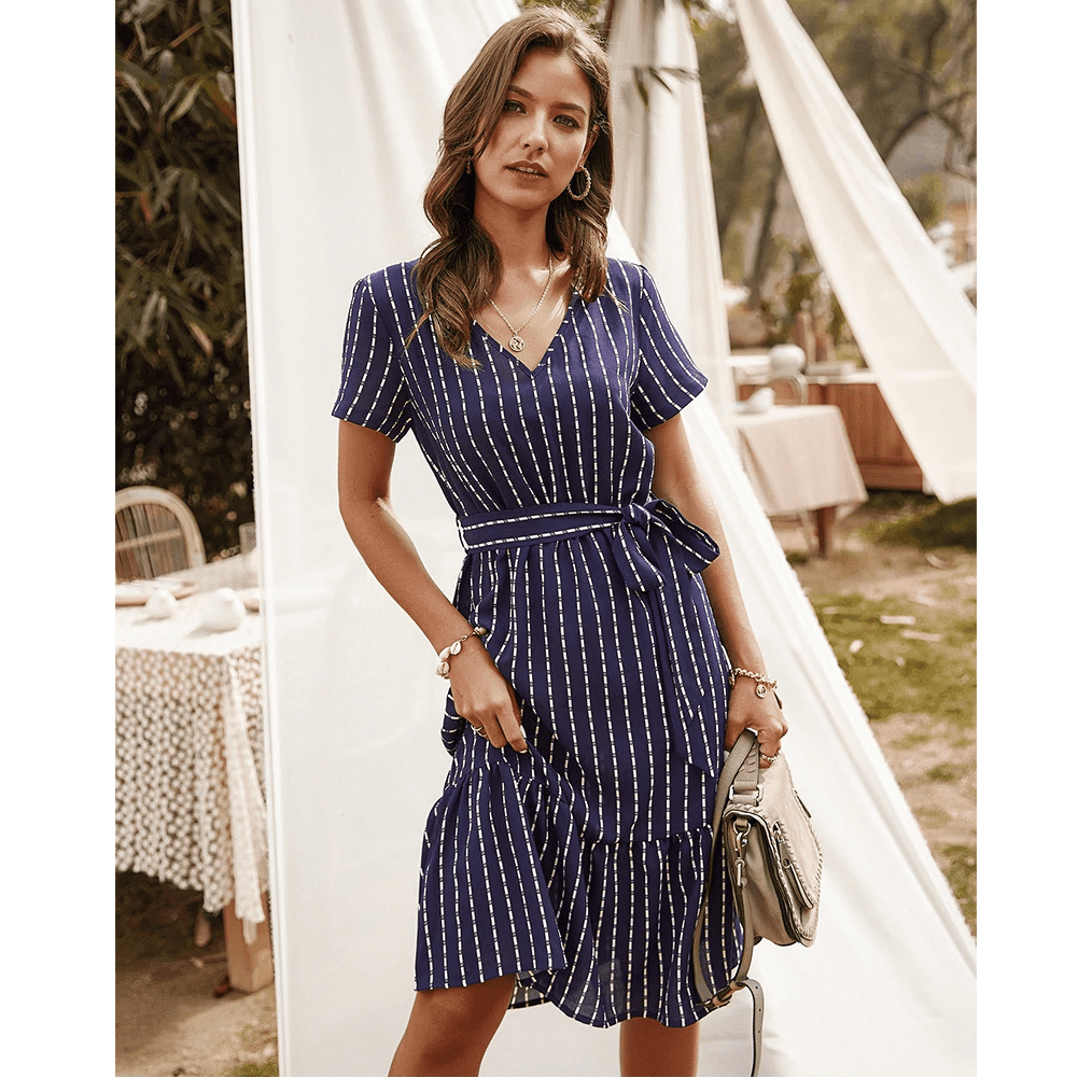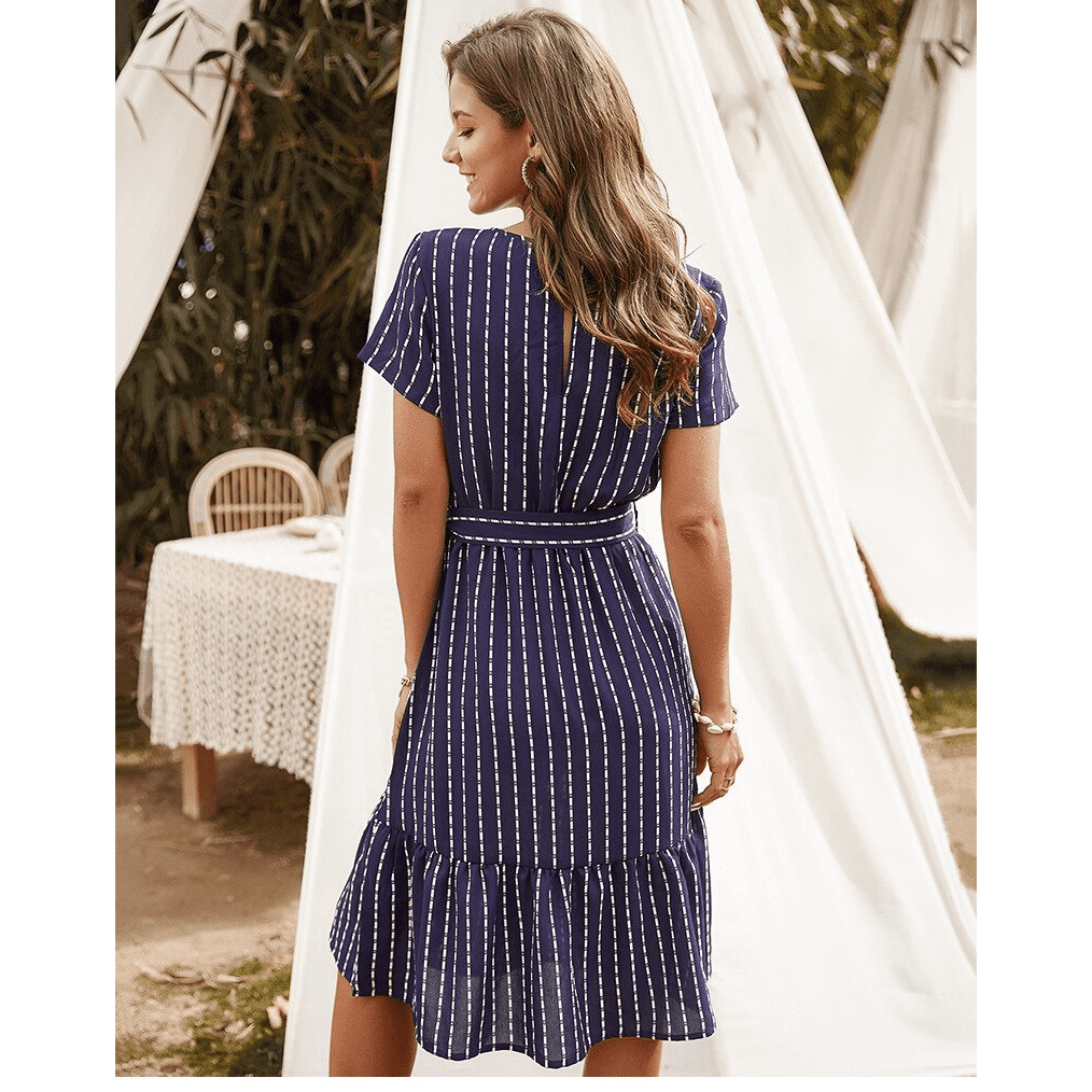 Με τη ναυτική μπλε απόχρωση της, το V-λαιμόκοψη και τη ζώνη που δένει, αυτό το κοντό φόρεμα αντικατοπτρίζει τέλεια το πνεύμα του χίπι-σοφιστικέ. Η ασύμμετρη γραμμή του προσθέτει μια διακριτικά μοντέρνα πινελιά. Ιδανικό για μια ρομαντική βραδιά ή μια καλοκαιρινή απόδραση.