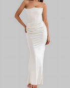 Tämä olkaimeton pitkä mekko korostaa siluettia samalla, kun se on sekä yksinkertainen että hienostunut. Sen muotoiltu yläosa korostaa vyötäröä hienovaraisesti, kun taas virtaava hame seuraa liikkeitäsi sulavasti. Täydellinen valinta juhlallisiin iltoihin, vastaanottoihin tai muodollisiin tapahtumiin.
