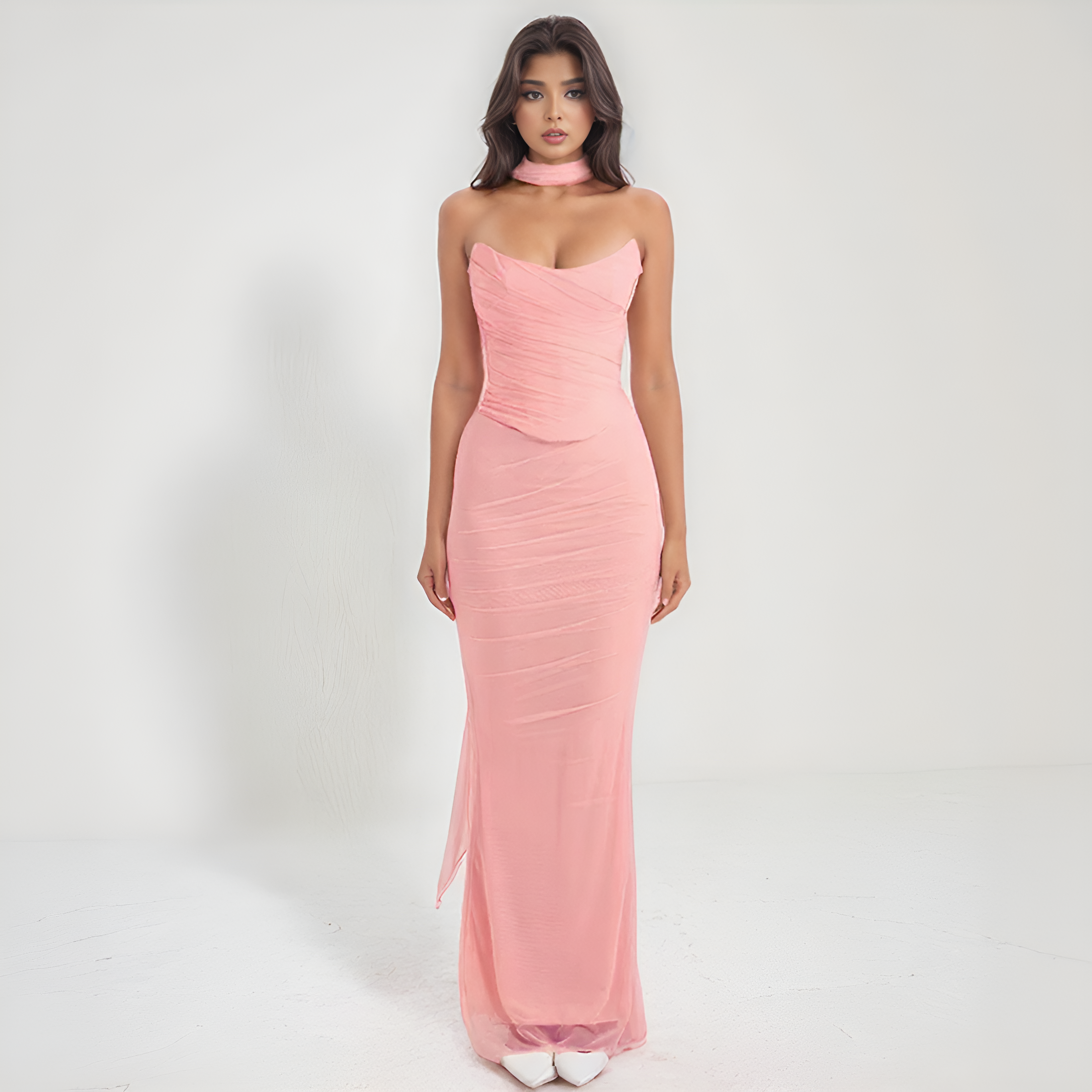 Perry | Kaksi osaa pitkä mekko – Olkaimeton eleganssi ja yhteensopiva huivi