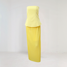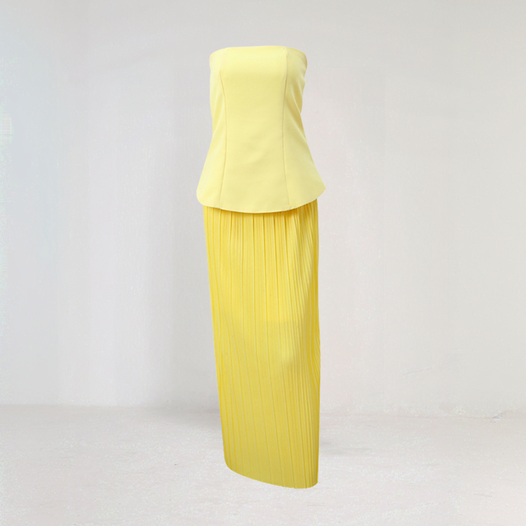 Tämä asukokonaisuus yhdistää olkaimettoman crop-topin, joka korostaa hartioita, pitkään laskostettuun hameeseen, joka laskeutuu sulavasti. Täydellinen tyylikkäisiin tilaisuuksiin, se yhdistää modernin hienostuneisuuden ja mukavuuden koko päivän ajan.