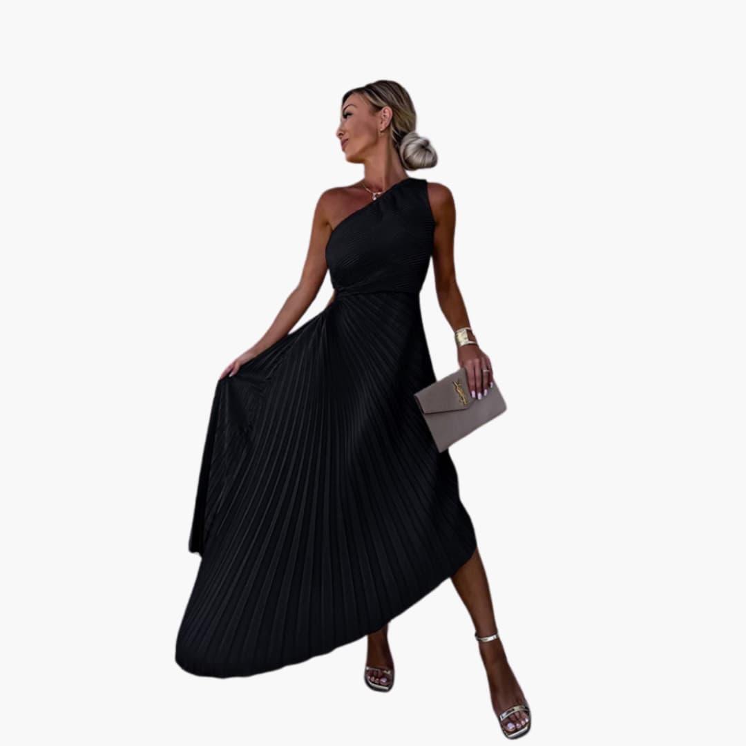 Tämä tyylikäs iltapuku hurmaa ainutlaatuisella olkapäällä ja hienostuneella epäsymmetrisellä leikkauksellaan. Se muotoilee täydellisesti vartalon kaaria, luoden upean siluetin. Täydellinen vaate loistaa kaikissa elegantimmissa tapahtumissasi.
