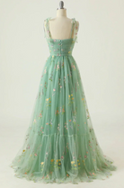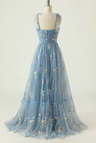 Cette robe de bal présente une délicate broderie florale sur du tulle. Disponible en versions courte et longue, elle est idéale pour les événements spéciaux et les sorties estivales.