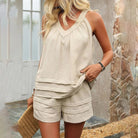 סט ללא שרוולים עם צווארון בצורת V משלב נוחות ואלגנטיות עם גזרה זורמת. אידיאלי לימים קיץ, הוא מציע מראה נינוח ומסוגנן בפשטות.