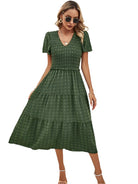 Ez a rövid ujjú bohém chic ruha ideális egy laza és elegáns megjelenéshez. Az elasztikus derékrész kiemeli a sziluettet, míg a laza szabás optimális kényelmet biztosít. Tökéletes nyárra, kirándulásokra vagy napos napokra.