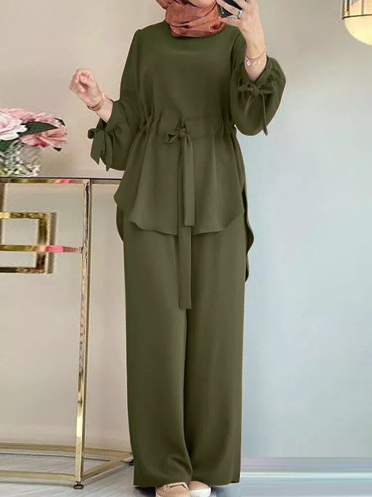 Versatile e raffinato, questo completo due pezzi unisce comfort e stile. Composto da una tunica lunga e un pantalone fluido, è adatto sia per uscite eleganti che per momenti quotidiani.