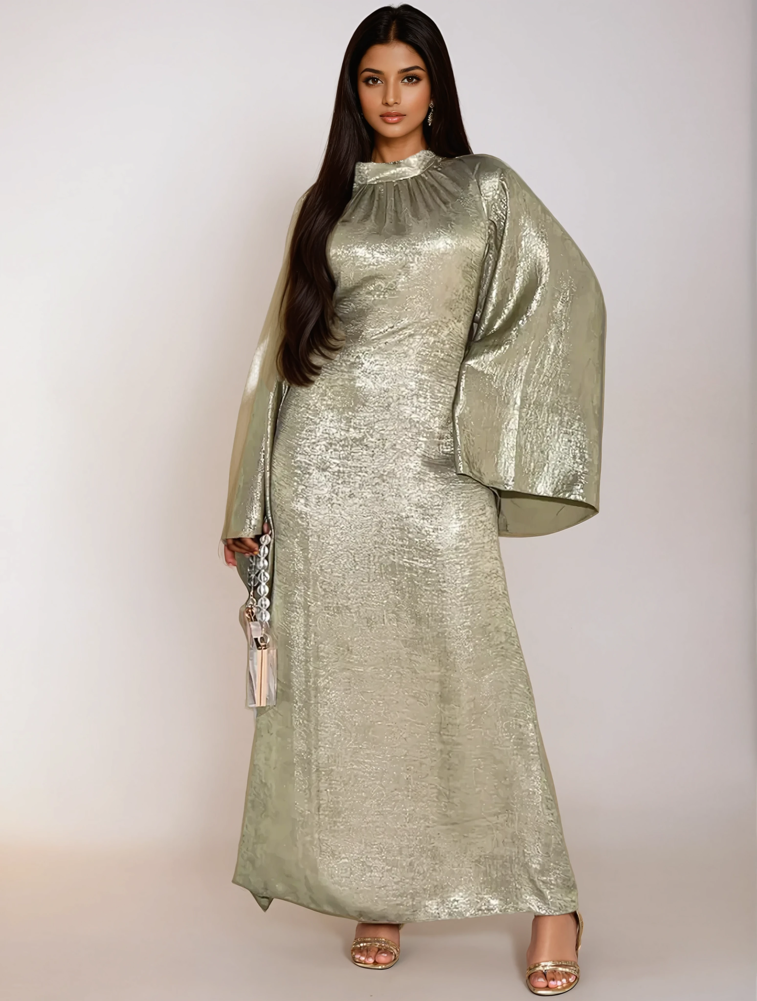 - Collo alto e maniche svasate per un'eleganza discreta