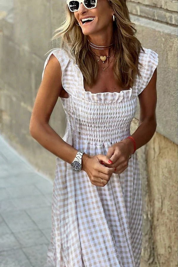 Con il suo motivo a quadri intramontabile e la sua vita arricciata, questo abito mette in risalto la silhouette con eleganza. Il suo taglio fluido garantisce un comfort ottimale, ideale sia per l'uso quotidiano che per occasioni più eleganti. Un perfetto equilibrio tra stile e leggerezza.