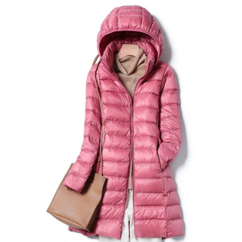Denne lange dunjakken gir en omsluttende varme samtidig som den forblir lett og elegant.