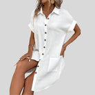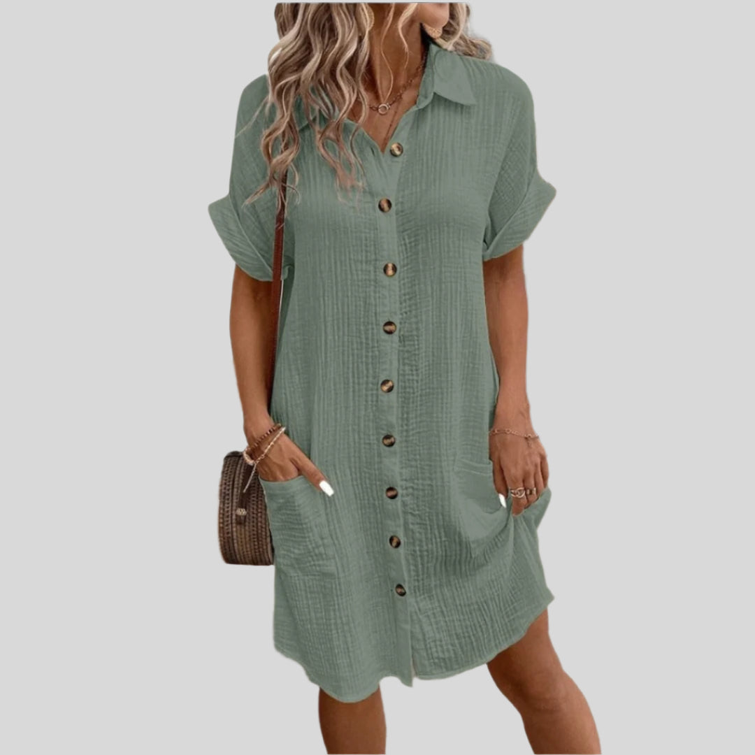 Deze knoopjurk heeft een ruime en comfortabele pasvorm. Verkrijgbaar in verschillende kleuren, past ze bij elke gelegenheid. Het tijdloze ontwerp maakt het een must-have in je garderobe.