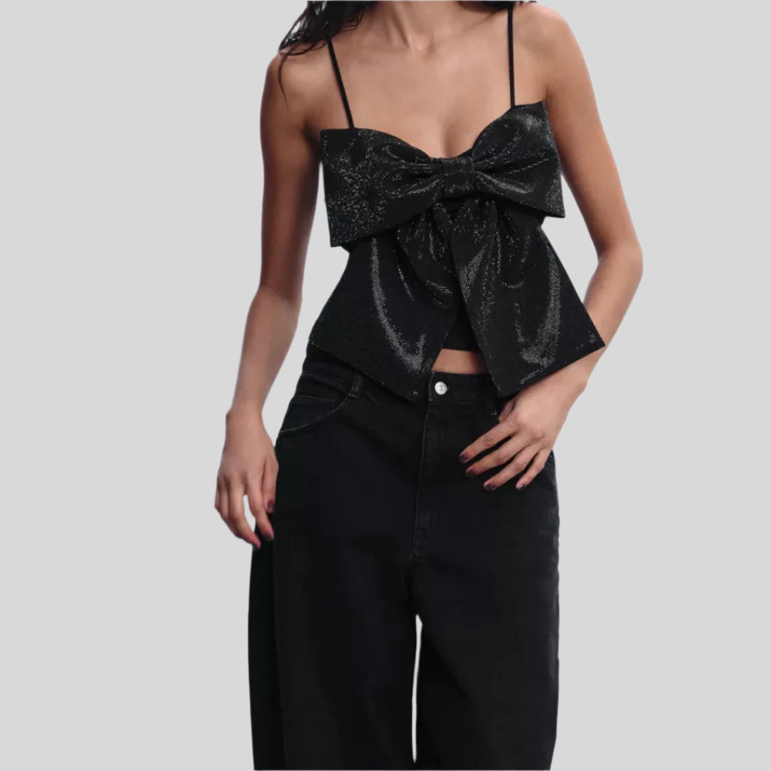 Tento elegantný top má žiarivý dizajn doplnený o výrazný uzol. Ideálny na špeciálne príležitosti alebo na to, aby ste dodali sofistikovaný nádych svojmu každodennému oblečeniu. Dostupný v rôznych veľkostiach, aby vyhovoval všetkým postavám.