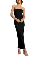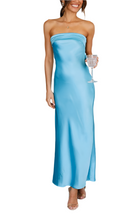 Denna långklänning i satin utan axelband formar en elegant och feminin silhuett. Lätt och luftig, den är idealisk för sommarkvällar, bröllop eller speciella tillfällen. Dess silkeslena fall ger en touch av raffinemang samtidigt som den säkerställer optimal komfort. Finns i flera färger för att passa alla stilar.